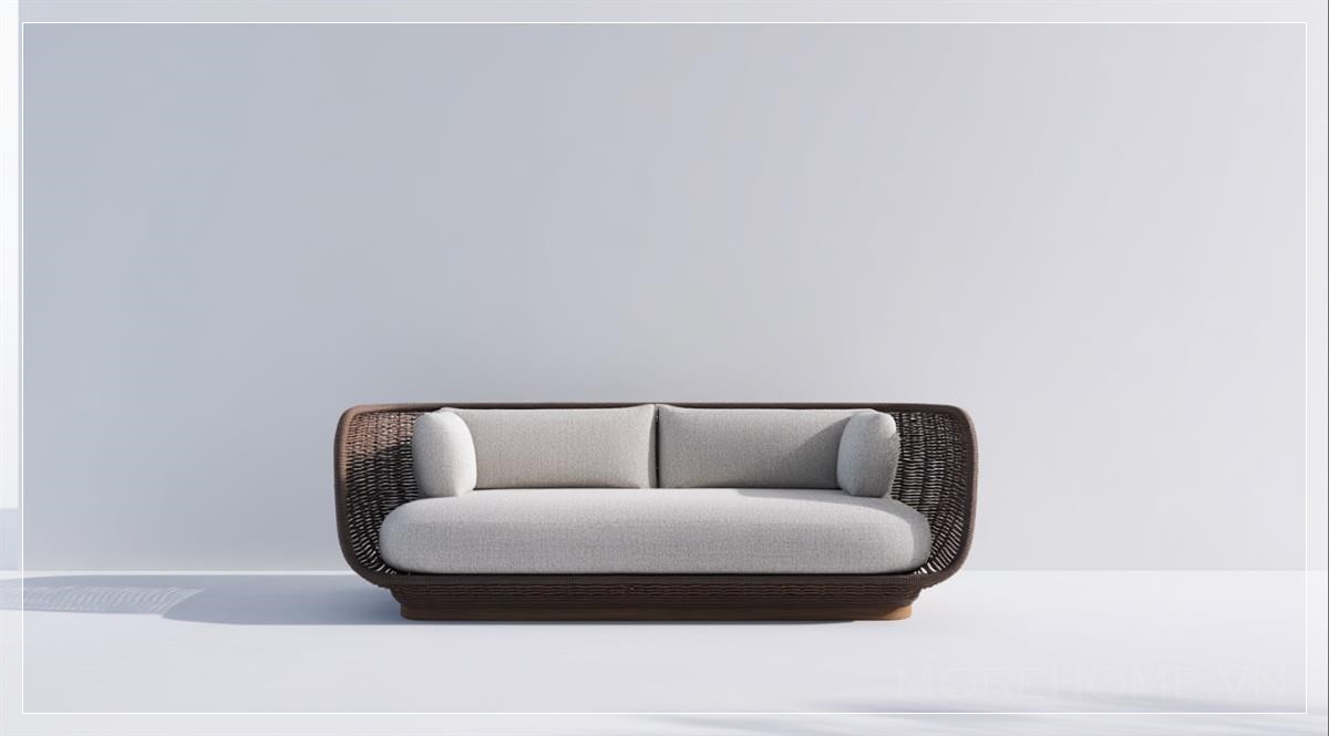 Ứng dụng thực tế của chiếc sofa còn thể hiện ở tính linh hoạt trong phối hợp nội thất. Có thể kết hợp nó với những bàn cà phê đá marble trắng, hoặc đặt gần mảng tường bê tông mài để làm bật lên tính công nghiệp. Nếu đặt trong không gian nhiều ánh sáng tự nhiên, chất liệu rattan sẽ bắt sáng tạo chiều sâu thị giác đặc biệt. Ngược lại, trong không gian ánh sáng nhân tạo, bề mặt vải xám trở thành phông nền lý tưởng cho các chi tiết trang trí như gối tựa, đèn bàn hay tranh treo tường tối giản.