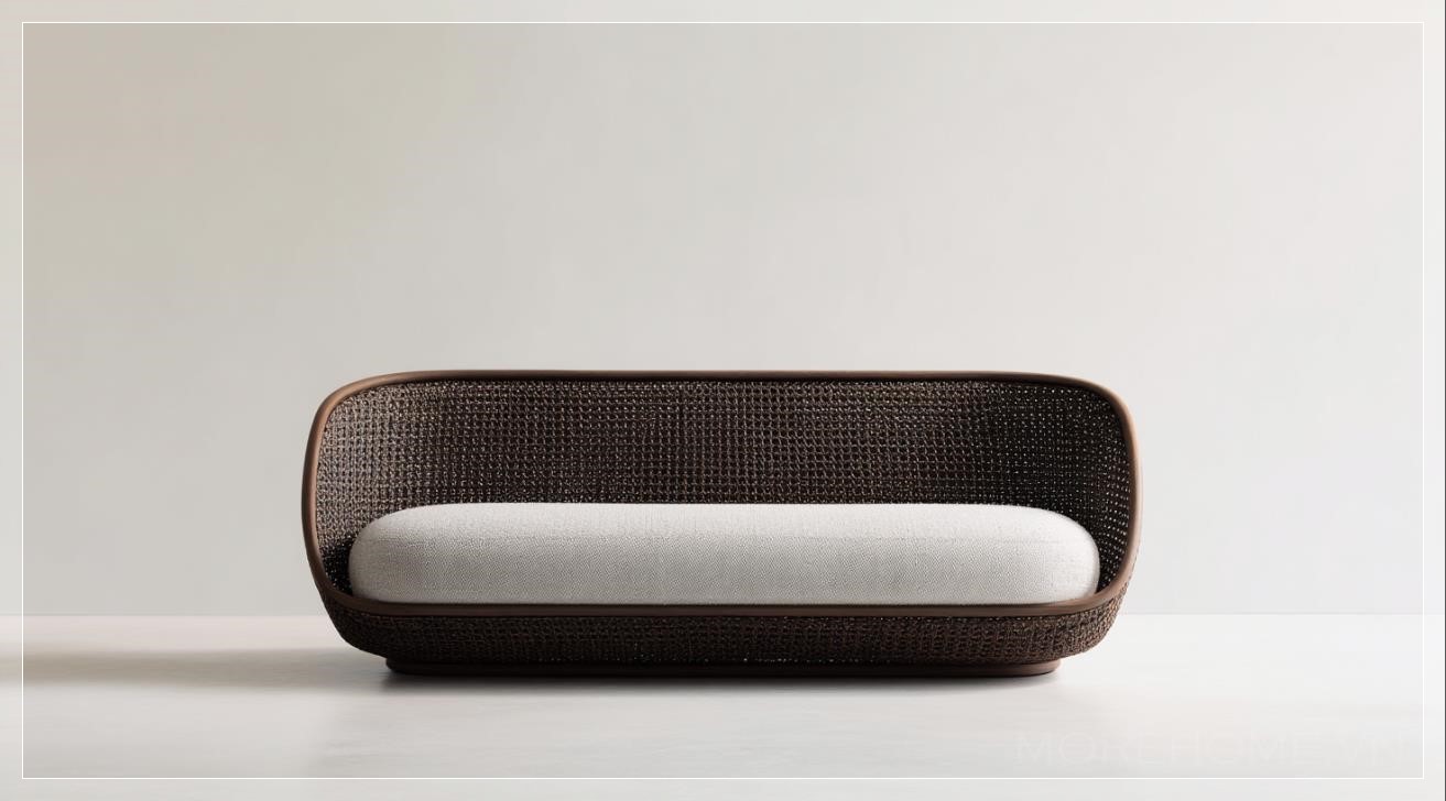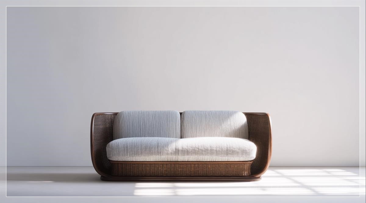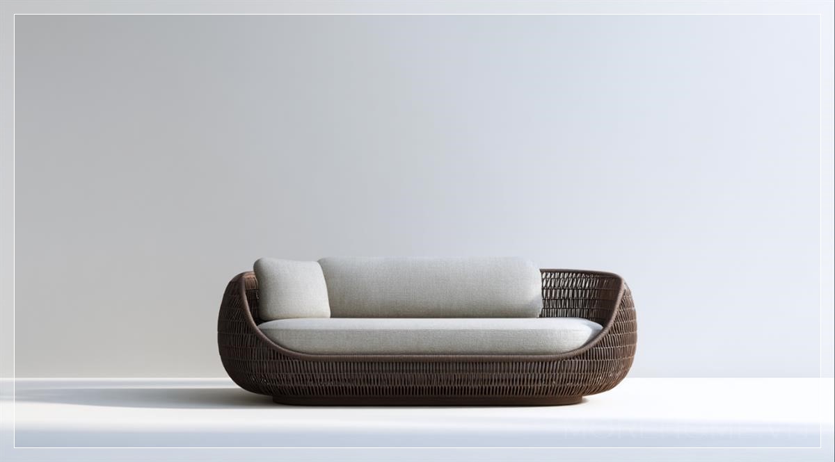 Điểm nổi bật của thiết kế này chính là sự tinh giản đến từng chi tiết. Với mặt trước được chụp trong điều kiện ánh sáng studio, bố cục tối giản giúp tập trung hoàn toàn vào sản phẩm. Chất liệu chính là mây tối màu (dark brown rattan) kết hợp vải xám nhạt (light gray fabric), tạo nên sự cân bằng giữa cảm giác tự nhiên và sự mượt mà công nghiệp. Nền trắng phía sau không chỉ tạo độ tương phản rõ rệt mà còn giúp tôn vinh cấu trúc và đường nét của sofa. Ánh sáng mềm và bóng đổ nhẹ nhàng làm nổi bật chất liệu cao cấp, trong khi tỷ lệ hình ảnh ngang rộng (128:71) gợi nhắc đến các layout của những sản phẩm công nghệ cao.