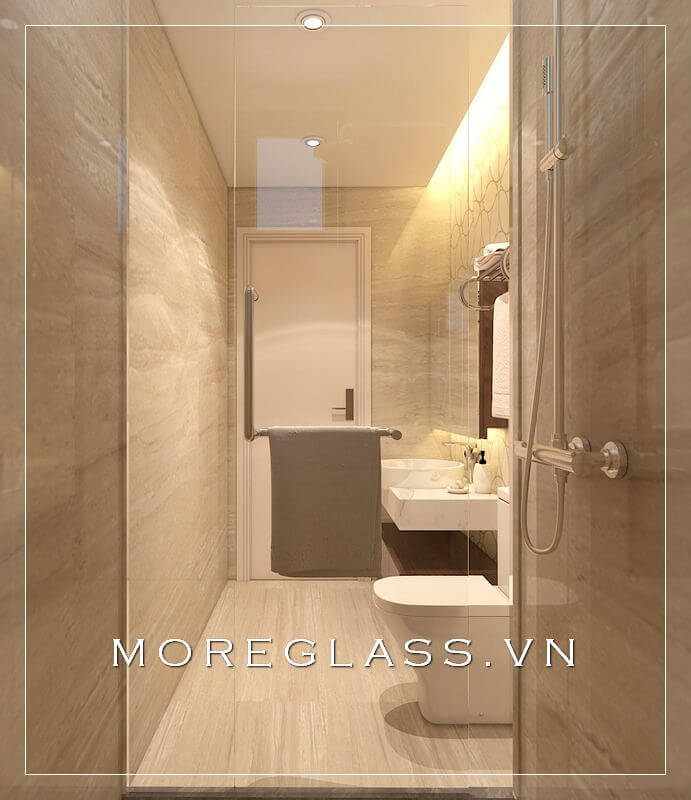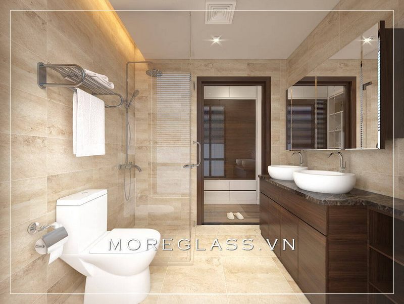 Vách kính cường lực là một sự tạo ra sáng tạo và ấn tượng của KTS, dùng để phân chia nhà tắm và WC.