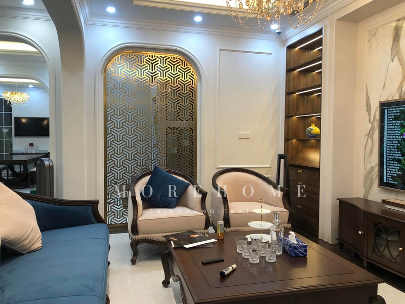 Bàn trà được đặt ở giữa phòng khách, tạo nên sự ấn tượng và lịch sự khi có khách ghé thăm.