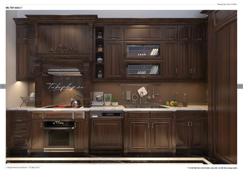 Mẫu tủ bếp gỗ óc chó nâu đẳng cấp được thiết kế với sự tỉ mỉ, kỹ cứng và các họa tiết chạm trổ đầy nghệ thuật, phù hợp với nhiều kiểu dáng nhà ở như chung cư, biệt thự hay nhà phố.